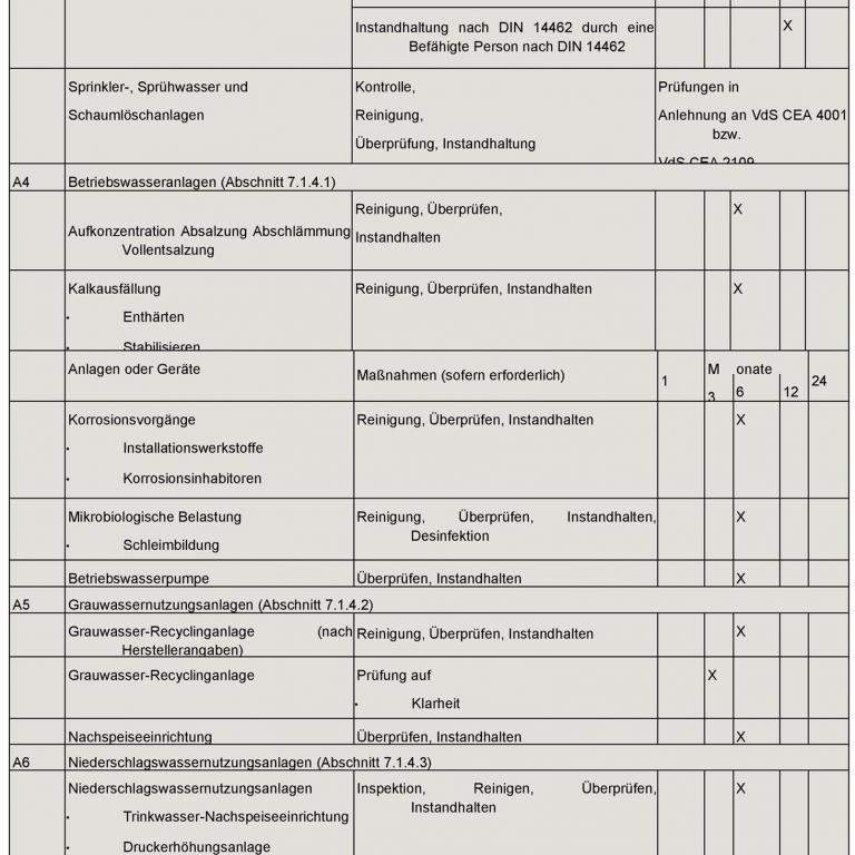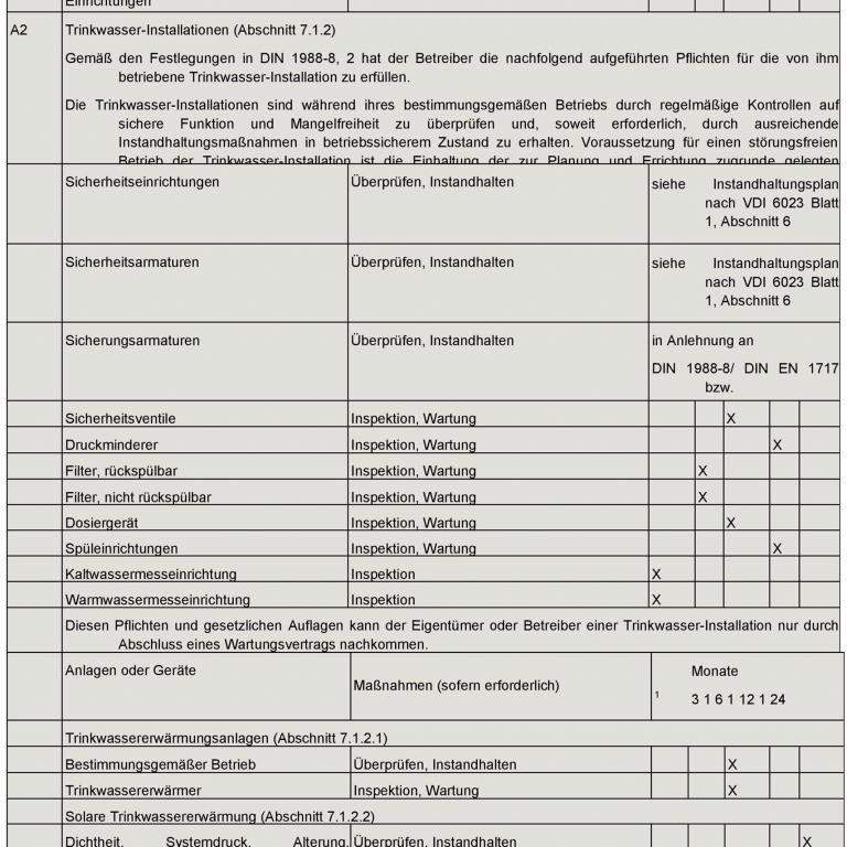 Die erforderlichen Aktivitäten, Maßnahmen und Überprüfungen für die Instandhaltung ergeben sich aus den Normen DIN 1988-8, DIN EN 806-5, VDI 6023 Blatt 1 und DIN 1986-3 sowie den Betriebs- und Wartungsanleitungen der Hersteller. Es liegt in der Verantwortung des Planers, diese Maßnahmen entsprechend der jeweiligen Sanitärinstallation festzulegen.